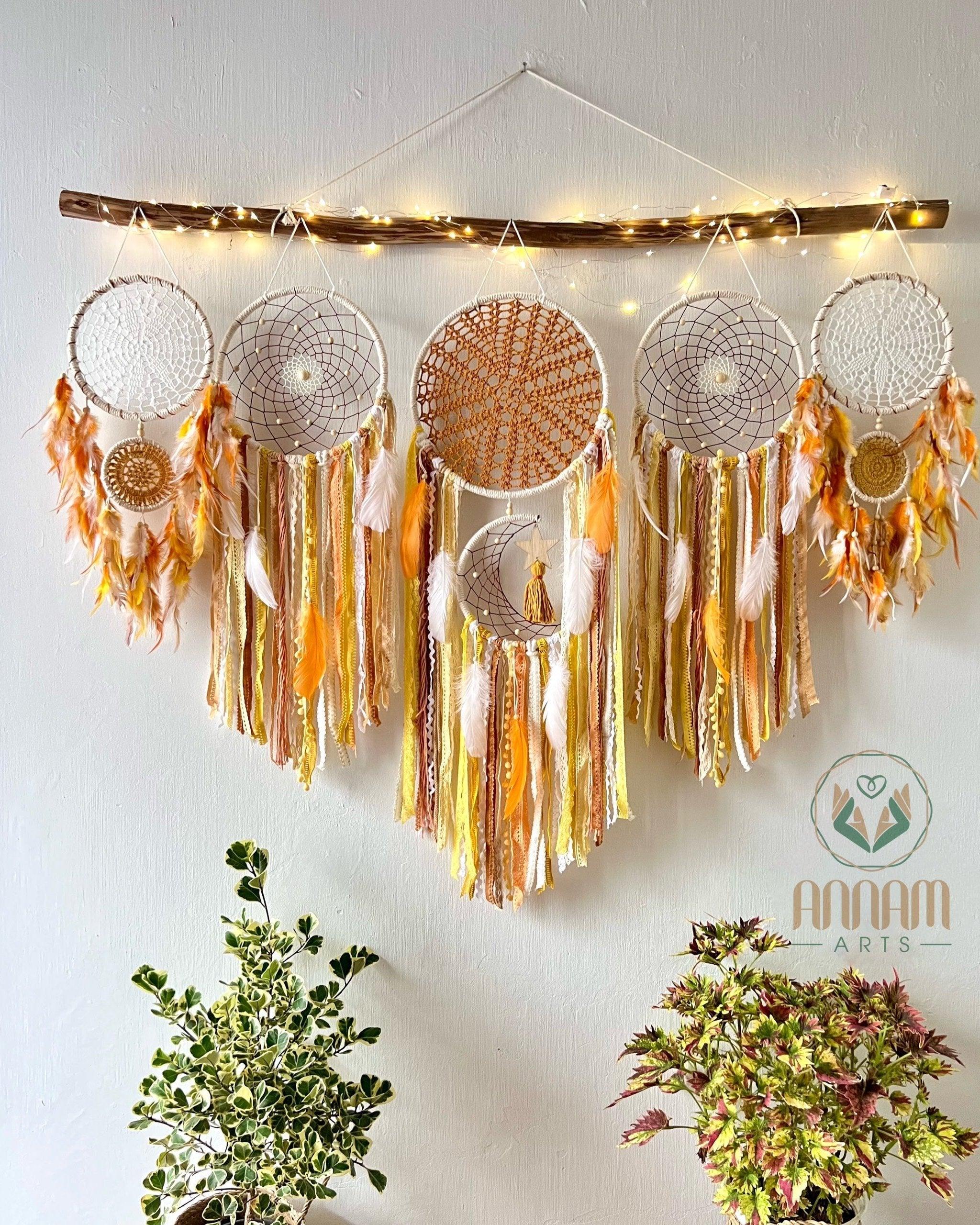 This large wall hanging dreamcatcher set is the perfect addition to any décor. Handmade with 100% natural materials, it features 5 dreamcatchers in varying sizes, creating a stunning and eye-catching display.
